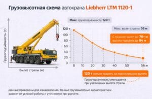 При збільшенні відстані до вантажу фактичне навантаження на кран істотно знижується, тому під час планування робіт і підборі автокрана Liebherr LTM 1120-1 обов’язково враховуються реальні умови підйому і технічні характеристики.